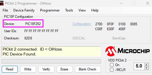 - Run the PICkit v2 programmer software. If everything is correctly configured, you will see the message saying that the PICkit 2 is connected and the micro-controller will be identified by the programmer.