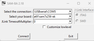 - Select the at91sam7s256-ek board and hit connect.