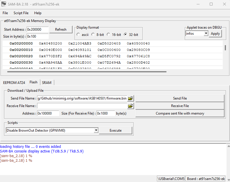 - Run the SAM-BA (I used the 2.18 version for Windows) and select the COM port that was created when you plugged the board to the PC.
