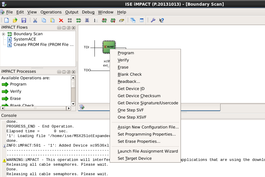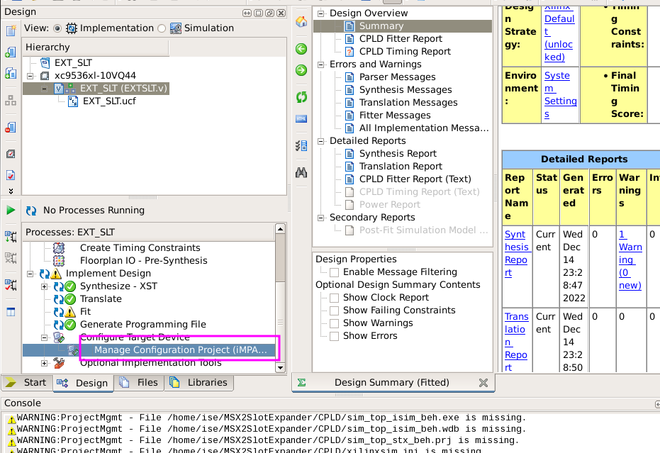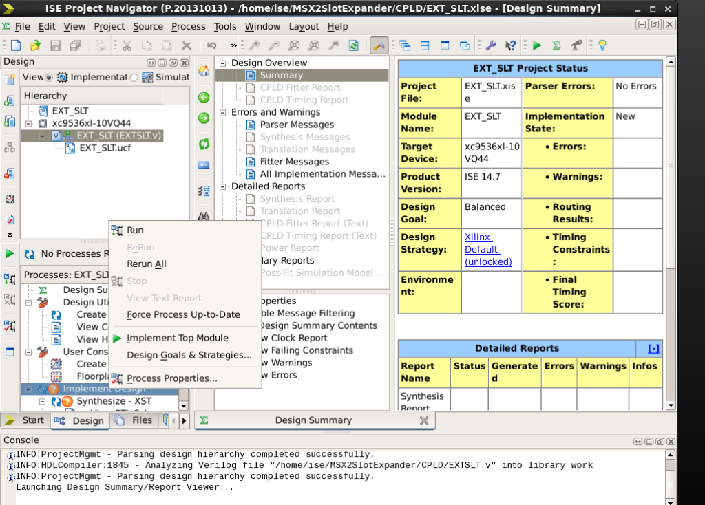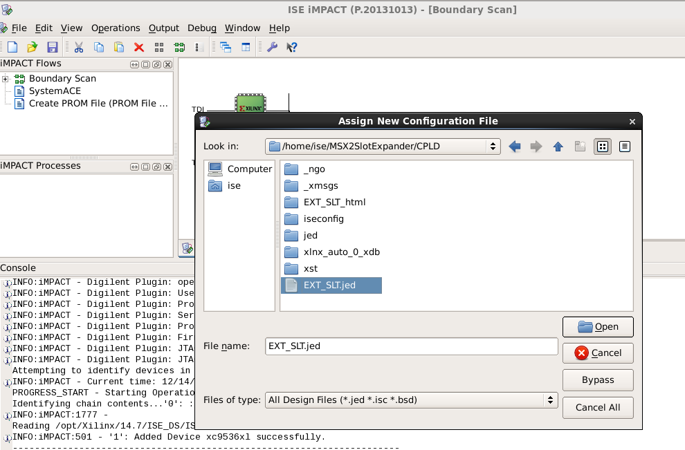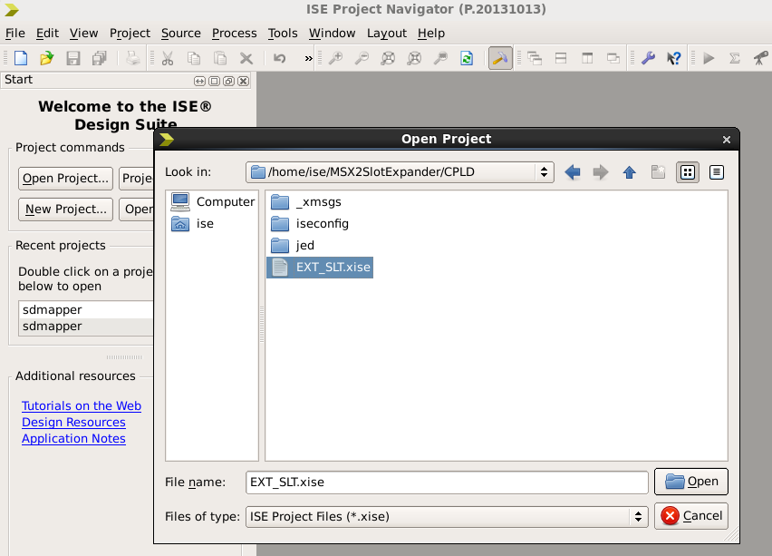 - Power the board with 5V. Run ISE and open the EXT_SLT project that is available on the CPLD folder on the project GitHub. You may need to download the content of the repo to your local machine.