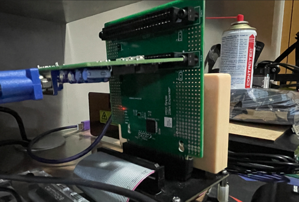 The board needs to be connected to a power source so you can program the CPLD. To avoid any risks to vintage hardware I’m using an FPGA based MSX to power the board and then program the CPLD. You can use another mechanism to power it during the program phase using the 5V and GND headers on the side of the board. With a pin header installed there you can also provide +-12V to the cartridges connected to the expander.