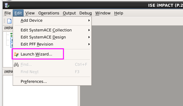 - When ISE iMPACT loads, select Edit and click Launch Wizard. Click OK to automatically connect to the chain.